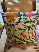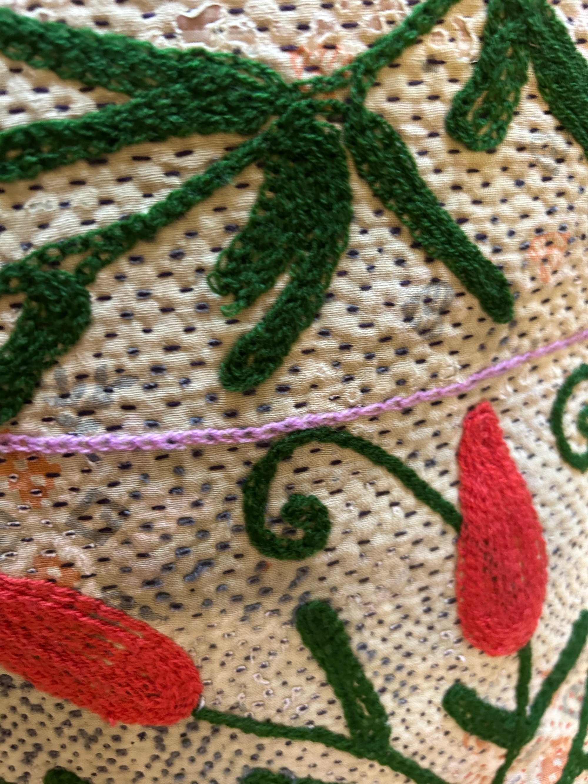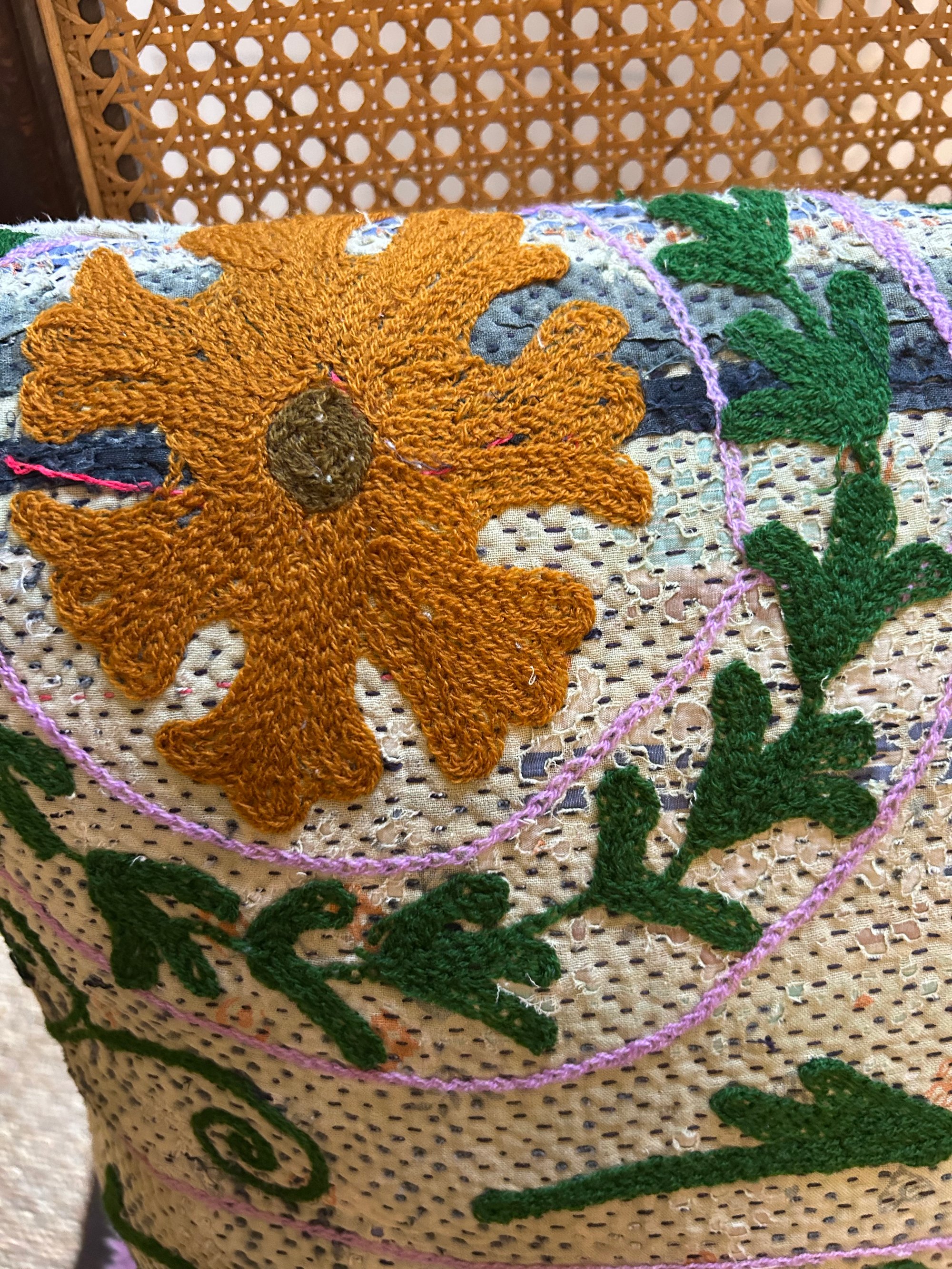 la housse est tout coton et la broderie est un point de chainette travailler sur un Kantha.